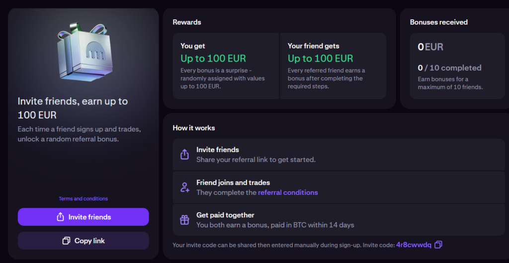 New users who join using a referral link may receive a crypto bonus after completing steps like account verification, depositing funds, and making a qualifying trade. The exact bonus amount and requirements may vary depending on the promotion and region.